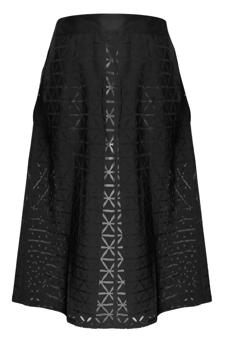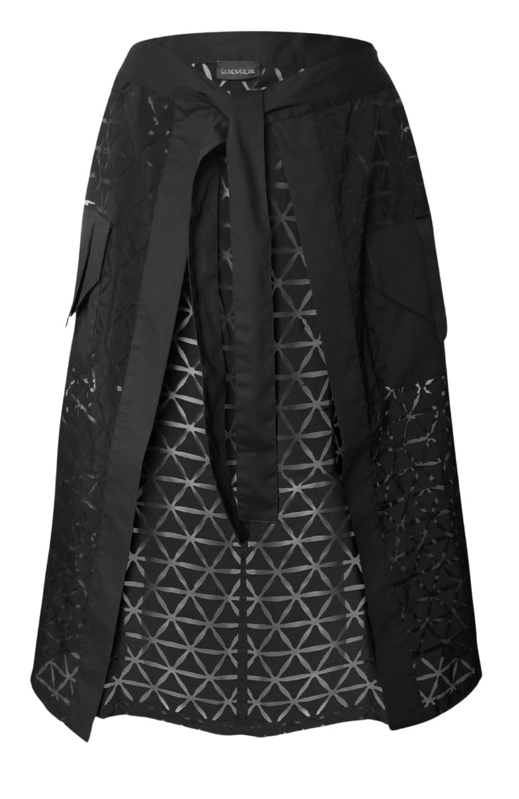 Dieser geometrische Viskose-Rock von Elsewhere Fashion ist ein ausdrucksstarkes Statement-Piece mit klarer, moderner Formensprache. Der Viskose-Ausbrenner-Stoff verleiht dem geometrischen Muster Tiefe und Struktur. Quadratische aufgesetzte Taschen mit Klappe setzen grafische Akzente, während schwarze Popeline-Kontrastlinien gezielt platziert sind, um die Silhouette optisch zu strecken. Ein vielseitiger Rock mit starkem Charakter und zahlreichen Stylingmöglichkeiten.